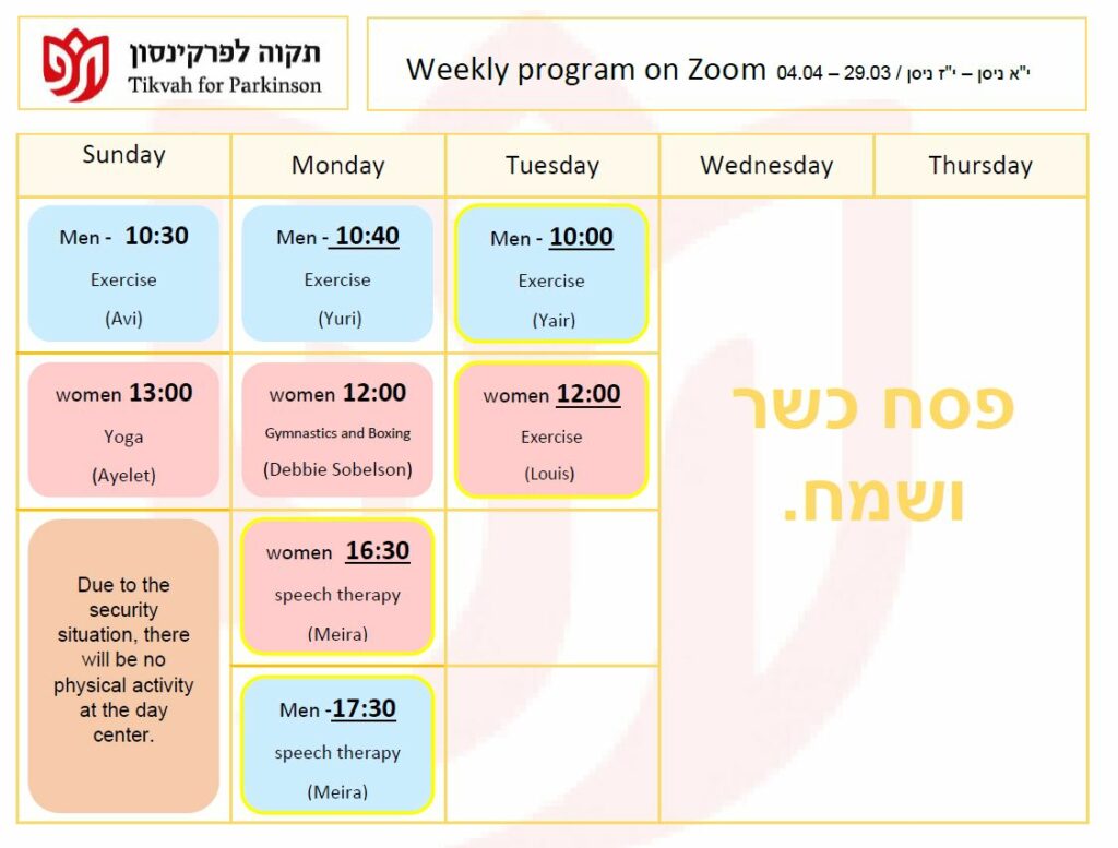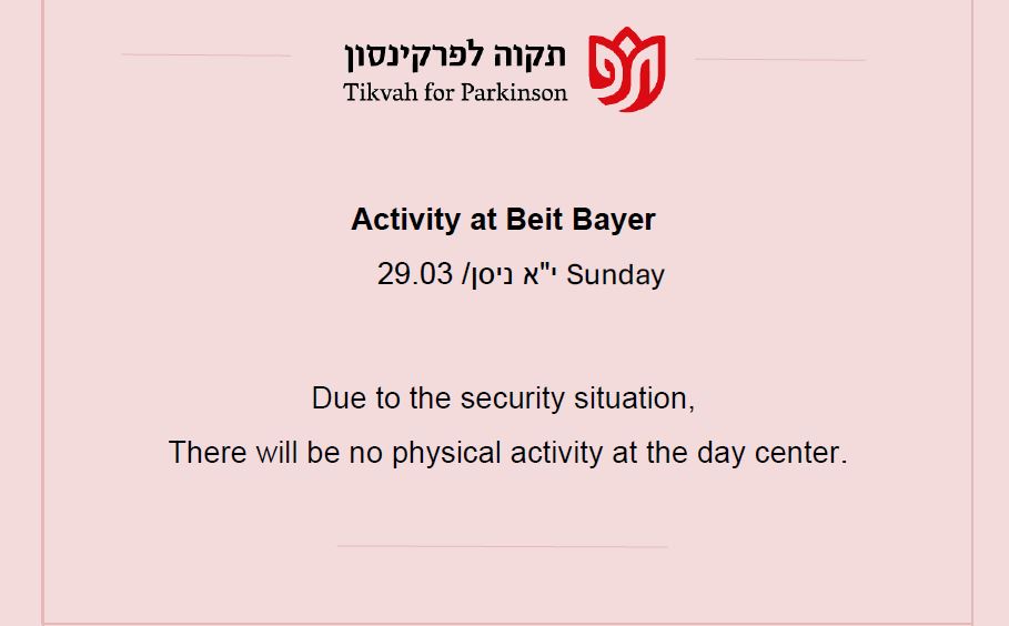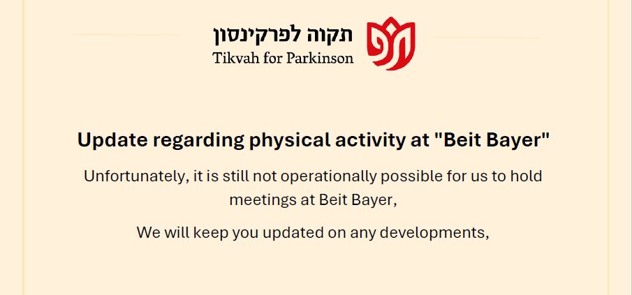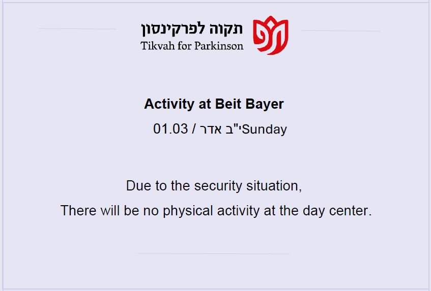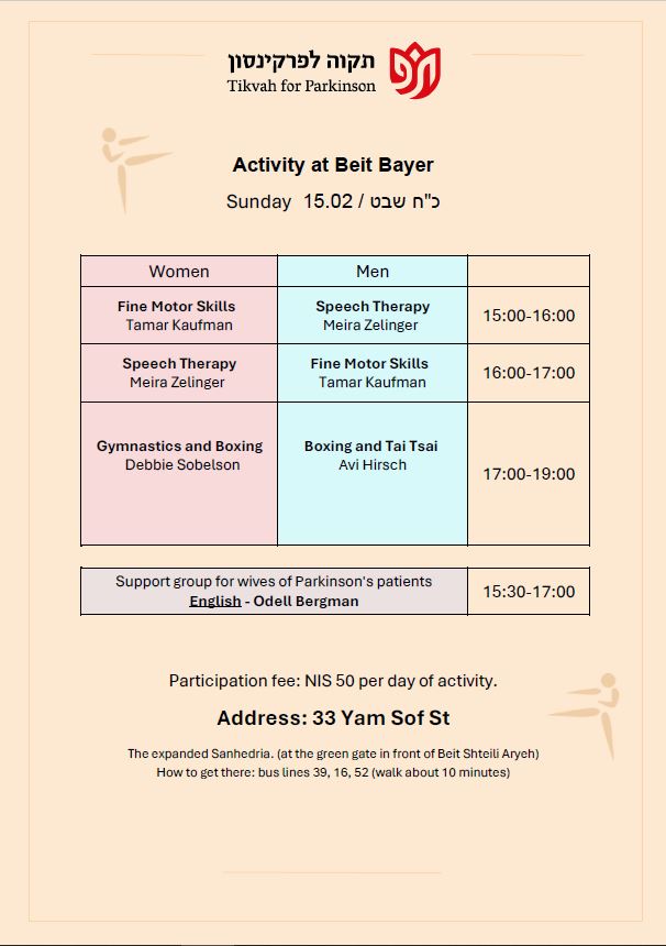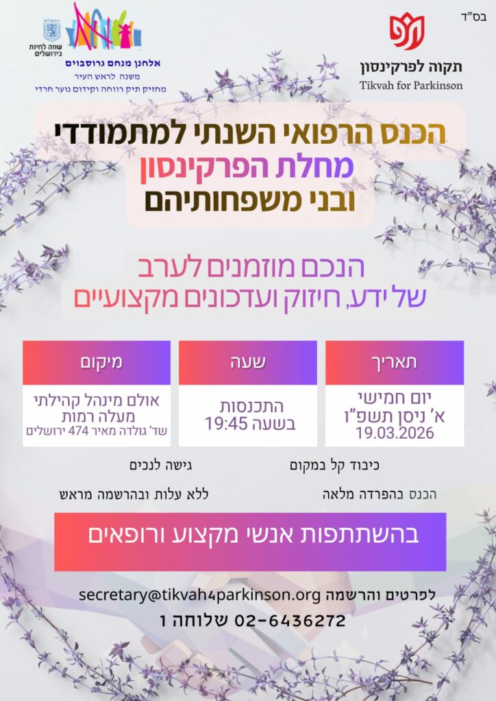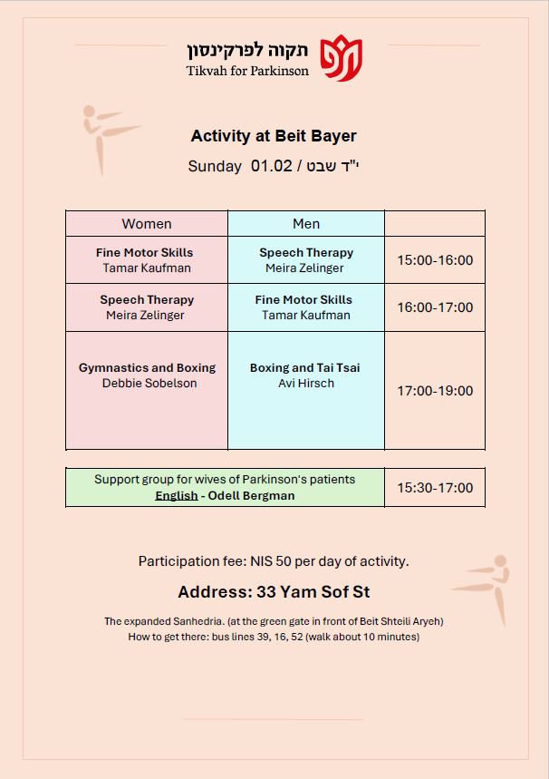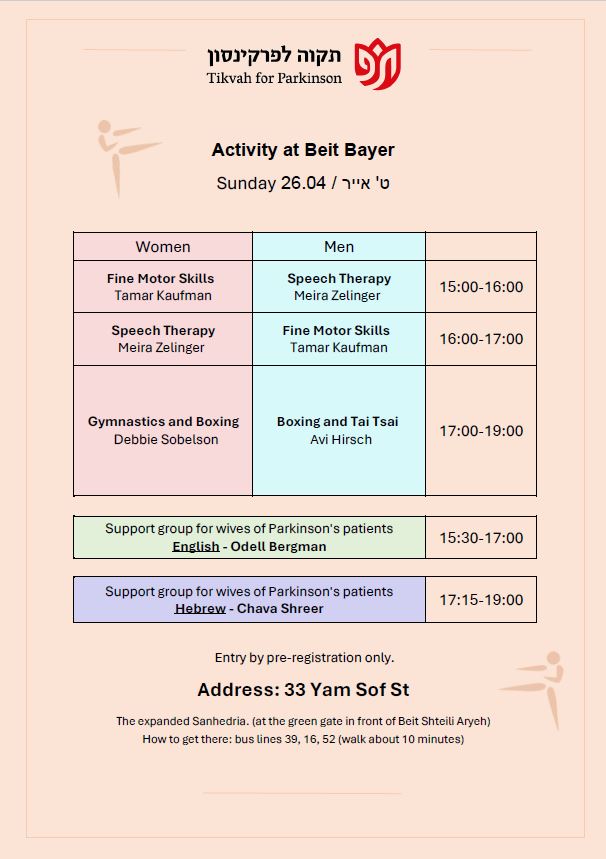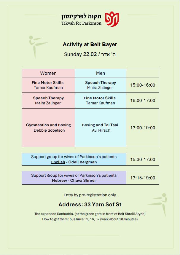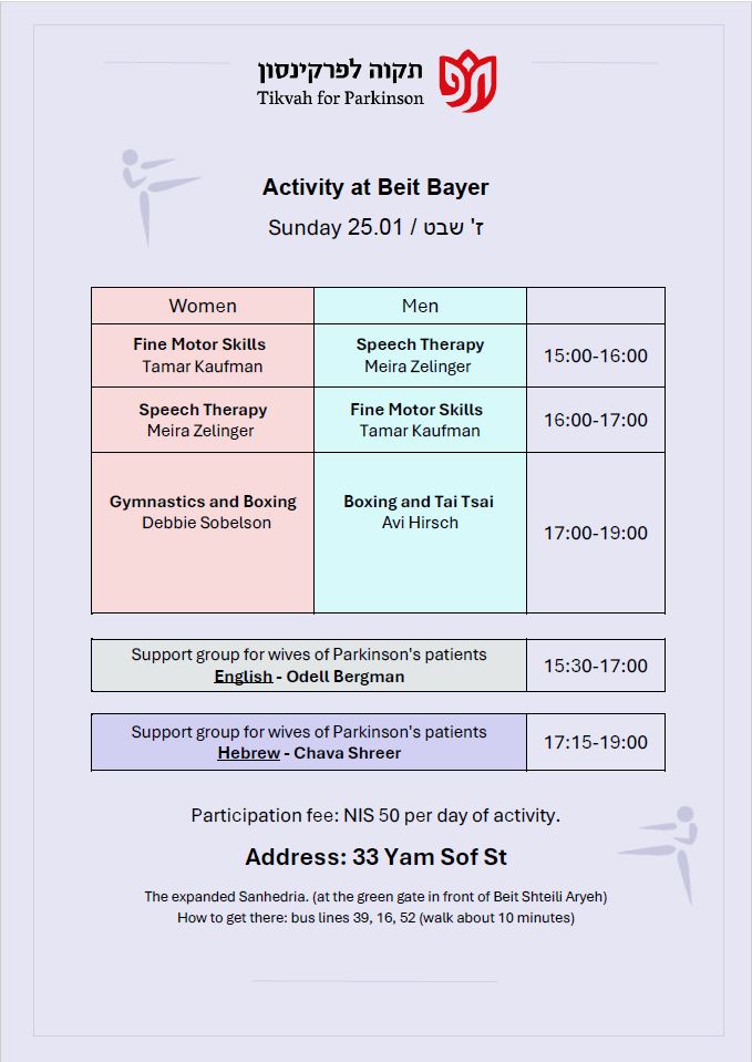 Our mission is to provide the Parkinson community in greater Jerusalem with the physical and emotional support they need to lead a productive and healthy lifestyle, to provide education for the Parkinson community, and to raise awareness of their special needs among the general population and government bodies.