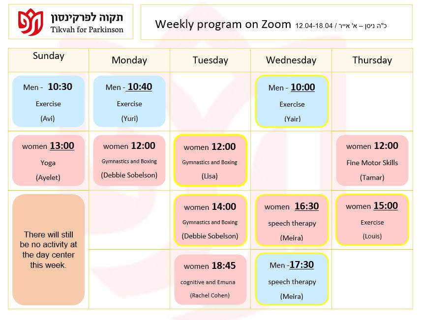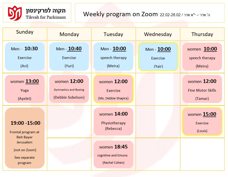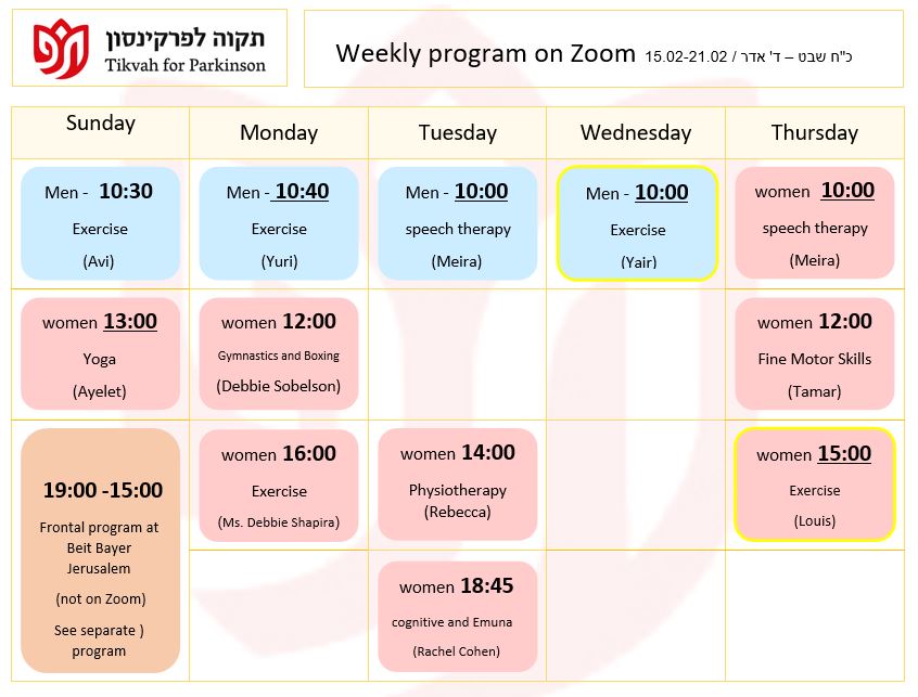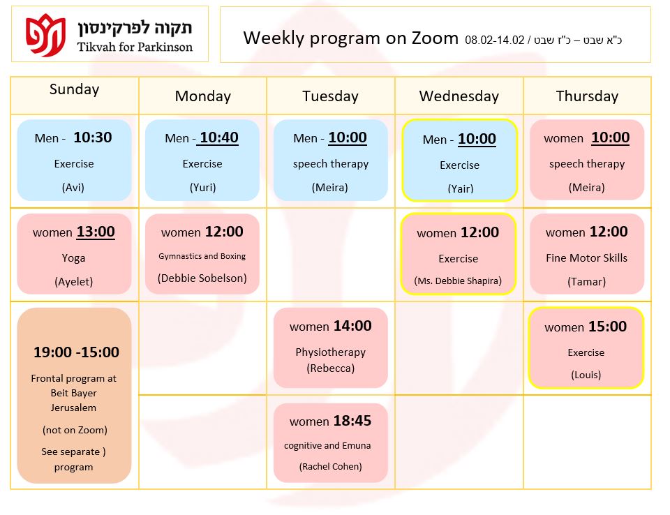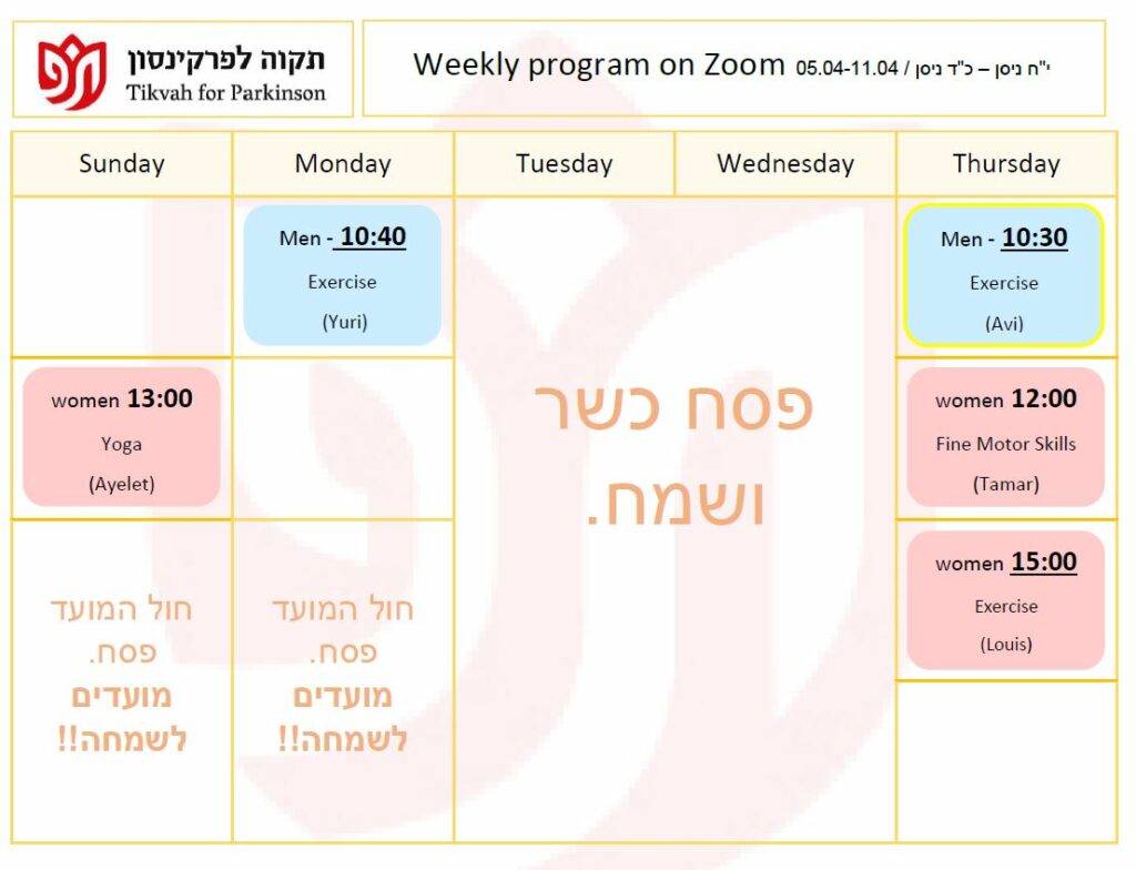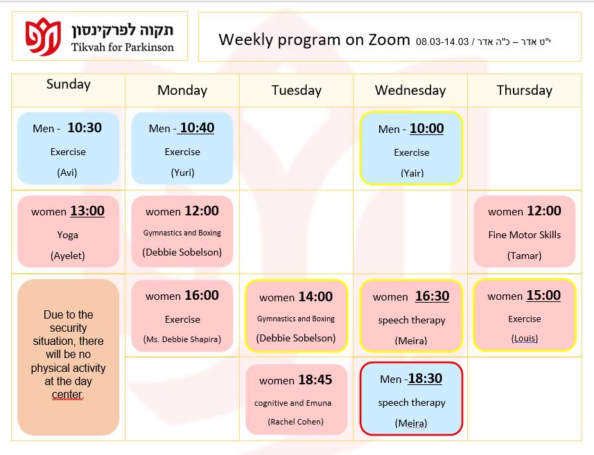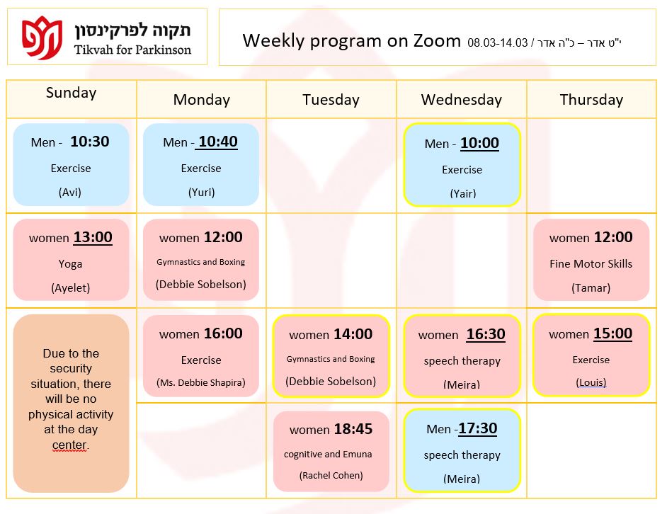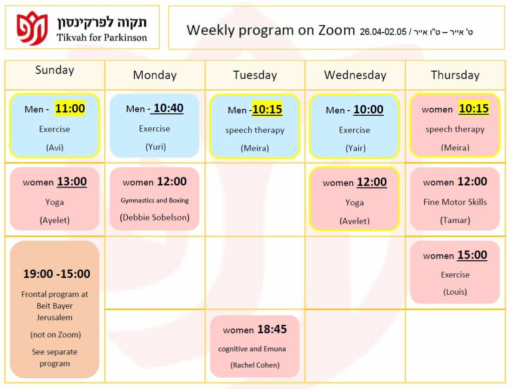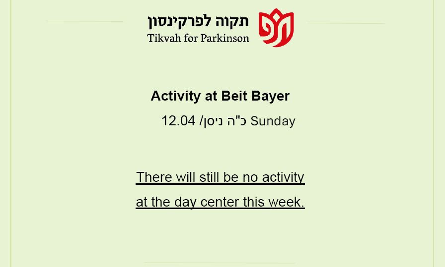Our mission is to provide the Parkinson community in greater Jerusalem with the physical and emotional support they need to lead a productive and healthy lifestyle, to provide education for the Parkinson community, and to raise awareness of their special needs among the general population and government bodies.