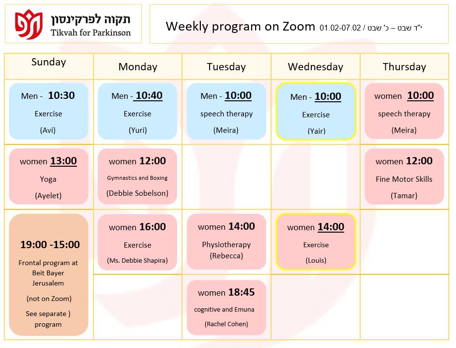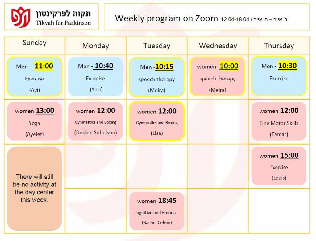 Schedule for the frontal activity at the day center in Jerusalem