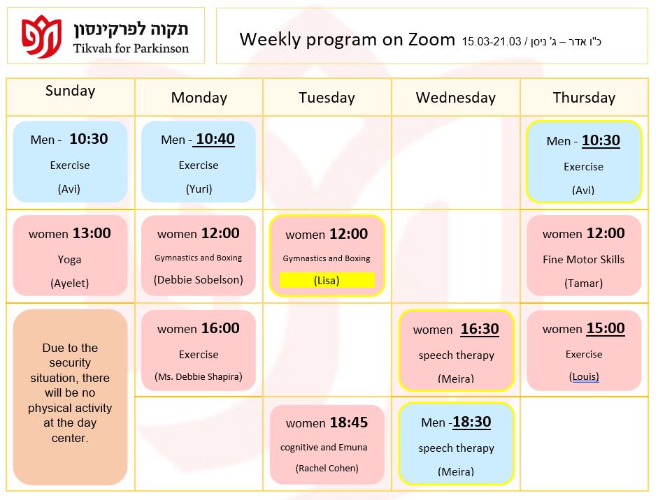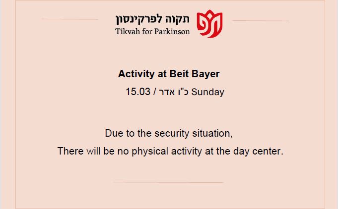 Our mission is to provide the Parkinson community in greater Jerusalem with the physical and emotional support they need to lead a productive and healthy lifestyle, to provide education for the Parkinson community, and to raise awareness of their special needs among the general population and government bodies.